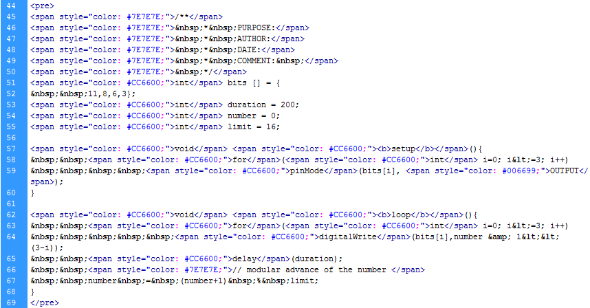 A straightforward example of CSS inline styles can be explored using the Copy as HTML feature of the Arduino IDE. When editing a sketch, the code appears to the viewer as follows,