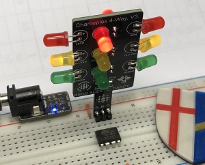 4-Way Charliexplex Traffic Light. A 4-way traffic light was developed to condition Grade 11 ACES to optimizing both hardware (3 pins) and software (Charlieplexed). Click here for a 30s video of the device in action. The plan is to introduce Charlieplexing during the final extended class in Grade 11 to set up their first project in Grade 12, the Charliexplexed Clock.