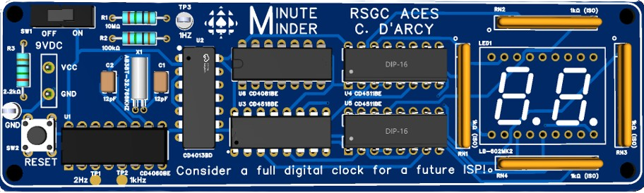 Minute Minder. A long-awaited alternative to the Grade 10 Counting Circuit project is the Minute Minder device. Inspired by an H:M:S Clock kit from Amazon this PCB stripped it down to just the seconds. The hope is that Grade 11 ACES might extend this base to create their own FULL clock as a possible ISP. Essentially this is a more accurate counting circuit driven by a 32.768 kHz tuning fork crystal (as the oscillator) divided down to 1 Hz for one second increments. The dual 7-segment display counts from 00 to 59 continuously. A reset button can restart the counting at 0. After a number of iterayions the final design for 75 pieces was submitted to JLCPCB on April 25, 2026.