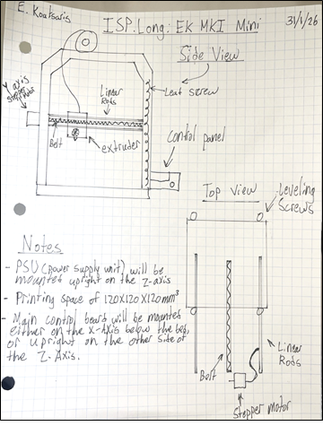 DESCRIPTION This Project is a Mini 3D printer with a build plate size of approximately 120 x 120 x 120 mm3. The user will be able to upload a standard G-code file and it will print it. It will run using a 3D Printer software called Marlin, and it will be belt and stepper motor driven. The various axis will ride on smooth linear rods with bearings. It will feature a direct-drive extruder and custom designed hot end cooling. The information and user interface will be displayed on an LCD screen with a rotary encoder. It will also feature dual Z axis rods for increased stability. It will print only PLA filament, so it will not feature a heated bed. The bed will be manually leveled with leveling screws. MCU STM32F103 (32-bit ARM, Creality V4.2.2 Ender 3 Pro Control Board HARDWARE The printer will be controlled using a Creality Ender 3 Pro V4.2.2 control board, which is based on a 32-bit STM32 microcontroller. The printer will use NEMA 17 stepper motors for the X, Y, Z, and extruder axis, with onboard stepper motor drivers on the control board. Motion will be guided using smooth linear rods with linear bearings, and belt and pulley systems will be used for the X and Y axes. The Z axis will use dual lead screws for increased stability. The printer will include mechanical endstop switches on each axis, a direct-drive extruder, and a standard hot end with a thermistor for temperature sensing. Cooling will be provided by dedicated hot end and part cooling fans. User interaction will be handled through an LCD screen with a rotary encoder. Power will be supplied using a 24V power supply unit. SOFTWARE The printer will run using Marlin firmware configured specifically for the Creality Ender 3 Pro V4.2.2 control board. The software will be heavily modified to account for the smaller bed size and overall dimensions. The firmware will interpret standard G-code files generated by slicing software and convert them into precise motor movements. Marlin will handle stepper motor control, acceleration, and motion planning, as well as temperature monitoring using thermistors. The firmware will also manage the LCD menu system and rotary encoder input, allowing the user to control the printer directly from the screen. Communication between the printer and a computer will occur via a micro SD card. DESIGN The printer will be designed using Fusion 360 to model the frame and custom mechanical components. This includes motor mounts, extruder mounting hardware, and custom fan ducts for hot end cooling. Some design elements will be inspired by existing open-source 3D printer designs and adapted to fit the size and layout of the printer. All components will be designed to be manufacturable using standard 3D printing methods. MECHANICAL All motion in the printer will be driven using stepper motors. The X and Y axes will use belt-driven motion systems, while the Z axis will use dual lead screws to raise and lower the gantry. The extruder will be directly mounted to the hot end for improved filament control and extrusion accuracy. A rotary encoder will be used as the primary user input device, and multiple fans will be used to cool the hot end, printed part, and electronics. COMMUNCATION The printer will operate using microSD card communication. G-code files will be loaded onto a microSD card and read directly by the control board during printing. This allows the printer to operate independently from a computer once a print has been started. Internal communication between components such as the LCD and control board will use standard digital communication methods. |