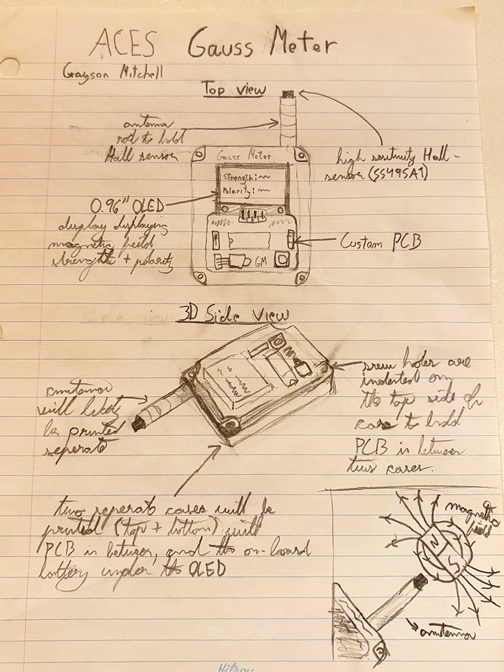 DESCRIPTION This project is a handheld magnetic field strength meter (Gauss meter) made to measure and display the magnitude of a magnetic field when the probe of the device is placed near a magnetic source. The device uses a linear Hall sensor to convert magnetic field strength into an analog voltage, which is processed by a microcontroller and displayed on a OLED screen. The project will use hardware, software, and design to make an ACES version of a Gauss meter. MCU 328p HARDWARE The project will use the ATmega328P microcontroller for processing and display control. The linear Hall sensor (SS495A), is used to measure the magnetic field strength. A 0.96” OLED display is controlled by the ATmega. The circuit will use a voltage regulator to create a steady 5V. SOFTWARE Arduino IDE will be used to control the actions of the Hall sensor and OLED display. The microcontroller will sample the reading from the Hall sensor very frequently, likely using an averaging system. These reading will then be outputted to the OLED on the top of the case. DESIGN EasyEDA will be used to make a PCB with all of the electronic parts. Fusion360 will be used to create a case to mostly enclose the PCB, along with make an antenna for the Hall sensor. The case will leave an area open on the top to show the on/off switch and a PBNO. MECHANICAL None COMMUNCATION I2C is used for the communication between the microcontroller and the OLED display. |