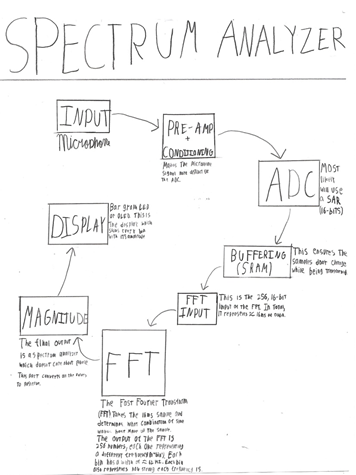 DESCRIPTION The Fast Fourier Transform (FFT) Spectrum Analyzer will have a microphone input and an output of a graph of frequencies and amplitudes. This will be built using only hardware components. The first stage is the microphone along with its amplifier. This signal is then converted into digital using an ADC (16-bit). After being converted to digital, it is stored temporarily, ensuring the data does not change while being transformed by the Fourier transform. Next, the Fourier transform takes each audio sample, and organizes it by frequency and its amplitude. This allows for the audio signal, which is comprised of multiple different frequencies, to be broken up into each frequency. The Fourier transform is built on the principle that any complex signal can be represented as a sum of sine, and cosine waves. Finally, it is displayed as a classic spectrum analyzer which shows frequency “bins” with their amplitudes. MCU None???? HARDWARE There are a lot of complex hardware aspects of this project. The main focus for this project is the fast Fourier transform (FFT). The FFT will be built, but for other parts (like the ADC), a chip will be used. Additionally, there will be about 4 SRAM chips used to temporarily store the ADC’s output, and 4 ROM chips. The ROM chips store the fixed, sine and cosine values that the FFT relies on. These values never change. SOFTWARE N/A DESIGN Fusion360 will be used to create a case for the final PCB. MECHANICAL N/A COMMUNCATION None |