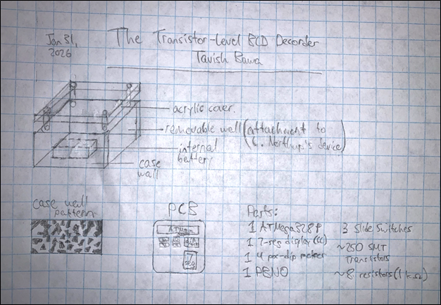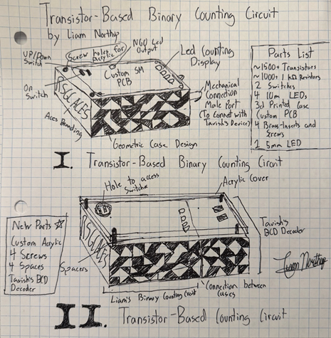 DESCRIPTION This device combined with Tavish B.’s Transistor-Based BCD Decoder serve to fully unpack the grade 10 counting circuit to the transistor level. My project unpacks the NAND Gate Oscillator to create a pulse signal using RC circuits and transistors. I will then unpack the 4510 Binary Counter chip down to the transistor-level. This would result in a final device of surface mount PCB with a custom 3d printed case featuring unique design elements and the ability to mechanically connect to Tavish B.’s device allowing seamless integration. My device will feature LEDs to display its output and feature an internal battery for portability. MCU None HARDWARE The hardware for this project will consist of a custom surface-mount PCB that demonstrates digital counting circuitry fully unpacked to the transistor level. A NAND gate oscillator built from individual transistors, resistors, and capacitors will generate a clock pulse using RC timing. This clock signal will drive a transistor-level 4510 binary counter. The output of the counter will be displayed using LEDs to visually represent the binary count. The device will be powered by an internal battery, connected to the PCB using a terminal block. SOFTWARE None DESIGN The design of my device involves the PCB design, Case Design, and Acrylic. The PCB will be laid out in clearly separated blocks containing transistors to show the different components that have been unpacked. Test points will also be present on the PCB for troubleshooting prototypes. The enclosure will be a custom 3D-printed case designed around the PCB and features modern geometric design for visual appeal. A mechanical docking interface aligns and locks with Tavish B.’s Transistor-Based BCD Decoder. MECHANICAL None COMMUNCATION None |