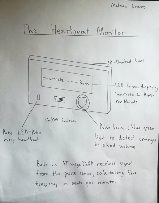 DESCRIPTION This device will be a heartbeat monitor capable of calculating a person’s heartbeat frequency using a pulse sensor. The sensor will detect changes in blood volume and label each of these changes as a heartbeat. A microcontroller calculates the frequency of these changes in beats per minute, displaying the heart rate on a screen. This screen will be driven by a microcontroller using I2C communication, allowing complex signals to be transmitted with minimal connections. MCU 328p HARDWARE A display will be incorporated onto a breadboard to show the heart rate in beats per minute, while an LED will be used to show each heartbeat. A pulse sensor will be wired to a microcontroller, detecting each heartbeat. A pulse sensor uses green light to detect changes in blood volume. Each change outputs a pulse, which is received by the microcontroller. SOFTWARE An ATmega328P microcontroller will perform all calculations for finding the bpm of the heartbeat. It will receive the signal input from the pulse sensor and determine the intervals between pulses. This interval will be shown on a display driven by the microcontroller. DESIGN A 3D-Printed case will be made with Fusion360 that contains a circuit board from JLCPCB. The circuit board will contain the microcontroller and sensor, as well as any hardware components in the circuit. The circuit board will be contained in the case with a cut-out for the display. MECHANICAL N/A COMMUNCATION SPI communication will be used to program an ATmega328P microcontroller chip inside the device. To drive the display, I2C communication will be used, minimizing the complexity of the circuit. |
