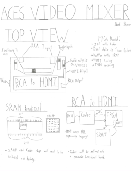 DESCRIPTIONThis device will take two inputs to produce an output. Both inputs will be RCA. The output will be toggleable from HDMI to RCA. There are 2 switches to control inputs. The inputs will each put in a video, that will mixed with a crossfader. The crossfader will be used to control bias for the inputs, determining the output. MCU GoWin FPGA HARDWARE The hardware to mix videos is quite simple. The conversion to HDMI is the source of hardware for this project. The RCA signal will go through a video decoder, controlled through I2C. The FPGA board will then take the video data, and frame buffer the individual frames using SRAM. The FPGA will also create HDMI timing before TMDS encoding the video. The board has a built-on HDMI port. SOFTWARE The FPGA board uses GowinIDE. The programming language for this IDE is HDL. This board uses I2C communication to collect video data from the decoder. This board will have to load information into SRAM, as well as retrieving information. There will need to be code to handle HDMI timing. The TMDS encoding will also need to be written. DESIGNJLCPCB will be used to create a breakout board for the SRAM chip, as well as the final device PCB. Fusion360 will be used to create a 3d printed case. MECHANICAL None COMMUNCATION I2C |