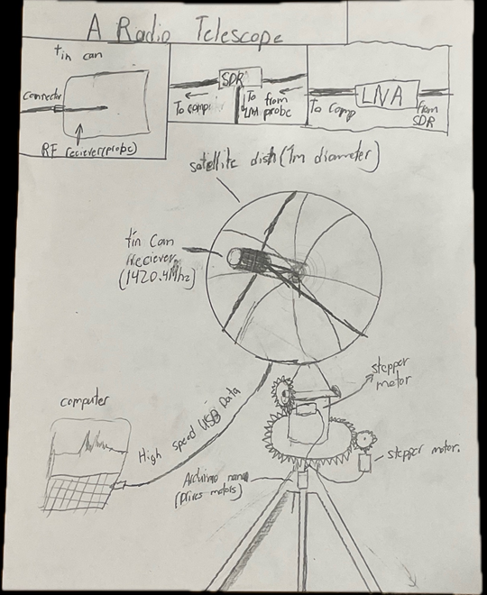 DESCRIPTION The goal of this project is to design a passive radar receiver, specifically tuned for the frequency 1,420.4 MHz. This radar will detect hydrogen signatures emitted by neutral hydrogen atoms throughout The Radars field of view. By detecting these electromagnetic waves, I'll be able to deduce data like Cosmic motion and structure. MCU Laptop MCU(x86_64), 328p for Stepper Motors HARDWARE In order to collect and reflect radio waves from space into the receiver, I will use a standard parabolic satellite dish, preferably around 1m in diameter. To serve as a waveguide, I will use a tuned coffee can (or similar metallic cylinder) to direct the reflected waves into the probe. For the receiver, I will utilize the RTL-SDR Blog V4, which samples the analog radio signature and converts it via an Analog-to-Digital Converter for the computer to process through a USB interface. To boost the faint signals from the galaxy, I will integrate a Low Noise Amplifier (LNA) specifically filtered for the hydrogen-line frequency. Finally, for any custom mounting or housing, I will use PETG plastic for its superior weatherproofing and UV resistance SOFTWARE For my primary coding language, I'll use C++. The chip I will be using is my computer MCU as any other chip would be too slow to properly receive these radio signatures. In order to actually visualize these radio signatures going through space I'll be using a visualizer in Python called Matplotlib As it is easy to set up and the information comes from the C++ code into a CVC text file within its red by the python and converted in a visualization DESIGN For a robust design, I will use Fusion 360 to model and create a specialized housing and mounting hub for my radio telescope components. This will ensure mechanical stability and precise alignment of the feedhorn at the dish’s focal point. Additionally, I may use EasyEDA to design a custom PCB for auxiliary power management or sensor integration; however, this remains an optional expansion depending on the primary system's stability. MECHANICAL For motion control system I will implement 12 volt stepper Motors. These motors will be controlled by either a Heltec V3, Or in Arduino Nano using dedicated stepper drivers to provide motor stepping for Celestial tracking COMMUNCATION For communication of primarily be using radio frequency which will detect the strands of hydrogen within space. And to communicate that information to my laptop it will be through a serial data code or usb-c 2.0. This will allow for extraordinarily fast transmission of data and large samples of data. |
