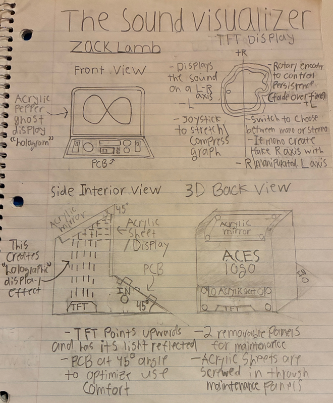 DESCRIPTION The project is a circuit that visualizes sound and displays it in a strange holographic effect. It is done through inputting the audio signals into an ATmega328P with it hovering around 2.5 V instead of 0 V. This is done through specific resistor and capacitor combinations explained in the hardware details section. This sound can be manipulated through a joystick, rotary encoder and potentiometer to affect how it is displayed. To display the sound, a TFT’s light is reflected off an acrylic mirror at a 45º angle onto another sheet of acrylic. This creates a holographic display called a pepper ghost display. There will be a slide switch to switch between mono and stereo audio. There will also be an audio output where you can listen to the sound as it is being manipulated. MCU 328p HARDWARE The sound is inputted through a 3.5 mm TS or TRS jack. Since audio hovers around 0 V, which is unreadable by the ATmega328P, a voltage divider in combination with several 100 kΩ fixed resistors and small capacitors will be connected in parallel with the audio signals going to the Nano’s analog pins. This forces the audio signal to hover around 2.5 V. For stereo (TRS), the left and right audio signals will be plotted on a graph with each signal being an axis. This will allow for various interesting patterns controlled through audio to appear such as Lissajous curves. There will be a slide switch to switch between stereo (TRS) and mono (TS). The slide switch’s output terminals will be connected to VCC and GND and the common terminal will be connected to one of the Nano’s digital pins. To use mono in this project it is done through software. The sound can be outputted and listened to through the Nano’s PWM pins, but it does have to filtered and lowered to hover around 0 V once again before it can be plugged into anything. To do this it is essentially the same system that was used in the input, except done in reverse. SOFTWARE The circuit is built off of an ATmega328P. For stereo, the MCU reads the L and R signal from its analog pins, and plots it on a graph with the L signal being the x-axis and the R signal being the y-axis. Since the incoming audio is hovering around 2.5 V, the Nano will use 512 as the origin for both axes. The MCU will then plot the incoming sound on the graph and Lissajous and other patterns will form depending on the specifics of how it is plotted. There will be mechanical devices which can manipulate the graph by changing the L and R values. To create the persistence effect, the screen will be cleared less often. For mono, there is only a L signal and no R signal, therefore the L signal needs to be replicated and slightly delayed. This new signal will act as a fake R allowing for more interesting patterns to be created. There will also be a simple display done through EEPROM that will appear on the display when it is first turned on displaying Z. LAMB and the ACES logo. DESIGN The TFT will be shining directly upwards inside a case. Above the TFT there will be an acrylic mirror at a 45º angle which will reflect the TFT’s light onto an acrylic sheet which will display the visualized sound. The case will have the PCB on a 45º angle below the acrylic so that it is at an optimal angle for use. This case will be 3D printed with black plastic and will form a box around the acrylic so that the holographic display has the maximum contrast possible, which is what is wanted with a pepper ghost display. The TFT will be hidden from view to emphasize the effect. The back of the case will have two panels that will be able to be unscrewed for assembly and maintenance. All sharp edges will be filleted for aesthetic. MECHANICAL There will be a joystick to transform the displayed sound through stretching or compressing it. There will also be a slide switch that can set a certain joystick position and lock it until the switch is turned off. A rotary encoder will also be included to change the persistence. What this means is the amount that the previous trail that the sound took is visible. The greater the persistence, the more of where the sound has already been is visible. If the rotary encoder’s switch is pressed it will reset the persistence to 0. Finally, there will be a potentiometer to increase or decrease the frequency/speed of the display. COMMUNCATION The ATmega328P will be programmed using SPI. The 2.4” TFT will also be using SPI communication. This means that both the programmer and the TFT will be wired in parallel with the ATmega328P’s SPI pins. |