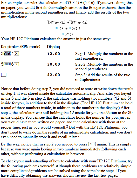 | (5 + 7) × (6 - 2) | 5 7 + 6 2 - × | 5 E 7 + 6 E 2 E - × | 48.0000 |