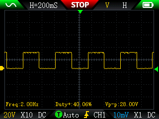 If the interrupt service routine (ISR) simply toggled the Nano's onboard LED, the period of the blinking would be half of the interrupt frequency, or roughly 1.9 Hz. The scope capture to the right reflects these conditions (somewhat).