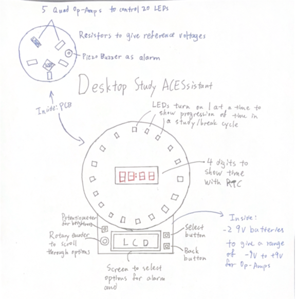 DESCRIPTION This is a study assistant that can be placed on a desk. It helps the user keep track of the time when studying by having a ring of LEDs that turn on 1 by 1 to display the progress of time for studying and break cycles. These are set by the user on an LCD screen using a rotary encoder and some buttons. There are also 4 digits in the center of the LEDs that can either be the countdown timer or the actual time, gotten through an RTC. This allows the device to be multi-purpose, serving as an alarm clock with the addition of a buzzer. The ring of LEDs are controlled by 1 singular pin from the microcontroller, which is the surface-mount ATmega328P-AU, giving a voltage value, and each LED has an Op-Amp with a different reference voltage to turn them on one at a time by slowly changing the voltage from the MC. The reference voltages will be given by resistors, and since head room is required for Op-Amps, two 9 V batteries are used to give a -9 V to +9 V range. MCU 328p HARDWARE SOFTWARE Arduino C DESIGN The case is designed in Fusion360, and the PCB is created through EasyEDA and made by JLCPCB COMMUNICATION I2C communication is used by the LCD and RTC MECHANICAL Piezo Buzzer |