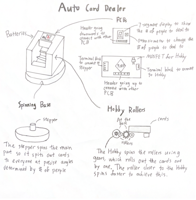 DESCRIPTION The Auto Card Dealer deals out poker cards for games like poker, president, and much more. It uses a stepper motor to rotate the output a specific degree every time for a number of people, which is shown on 7-segment displays, and can be changed using a potentiometer. After each turn, two rollers connected to a hobby motor deals out one card. A battery is used since the rotating will cause a power cord to get tangled. MCU 328p DESIGN The PCB will be designed in EasyEDA and made by JLCPCB. Most of the parts, if not all, will be surface mount. The case will be made in Fusion360. COMMUNICATION N/A MECHANICAL For the stepper motor, a NEMA 23 motor will be used with a DM542T driver since the motor needs to be strong to turn the output of the cards. A 24 V battery pack will be used with it. The hobby motor will just be the one in the kit. |
