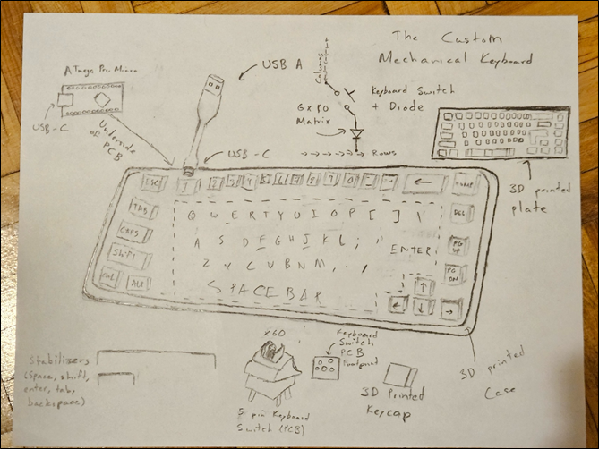 DESCRIPTION The Custom Mechanical Keyboard is a fully functional USB keyboard designed and programmed from scratch, focusing on the design and software components of engineering. It is a 65-form factor keyboard including a full alphanumeric layout, modifier keys (Shift, Alt, Ctrl, and Caps Lock), arrow keys and other function keys (Escape, Enter, Tab, and Backspace). The keyboard will be powered through a USB connection to a computer, functioning as a Human Interface Device (HID). The keyboard will use 5-pin PCB-mount mechanical switches arranged in a matrix with diodes (the diodes are to prevent ghosting and ensure overall accuracy). There will also be stabilizers for larger keys (space bar, enter, etc.). I will be using the ATmega Pro Micro (ATmega32U4) as the MCU to code my own matrix and keymap. MCU ATmega Pro Micro/32U4 DESIGN KiCad/EasyEDA – Design the keyboard’s PCB Fusion 360 – Design the keyboard’s keycaps, plate and case KeyboardLayoutEditor – Initial Design for my Keyboard + PCB Layout COMMUNICATION USB (Human Interface Device (HID)) MECHANICAL The buttons themselves |