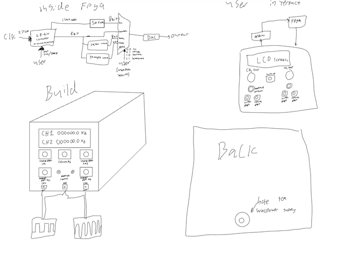 DESCRIPTION Will use a FPGA and Verilog to create two 28 bit Direct Digital Synthesis (DDS) counters that supplies a sin, square, and triangle wave ROM and will utilize a MUX to let the user select which wave output they want. The device will also use op amp gain mechanics to allow the user to select a certain amplitude for the wave. The project will also use a Arduino as a user interface to power a LCD and user controlled buttons and dials. MCU 328p HARDWARE Gowin FPGA SOFTWARE VERILOG (Hardware Design Language) and LCD LIBRARY DESIGN Will make a box with a PCB indie [sic] using Fusion360 and JLCPCB COMMUNICATION Will use some sort of communication protocol to have the Arduino communicate with FPGA. CD: ??? MECHANICAL N/A |