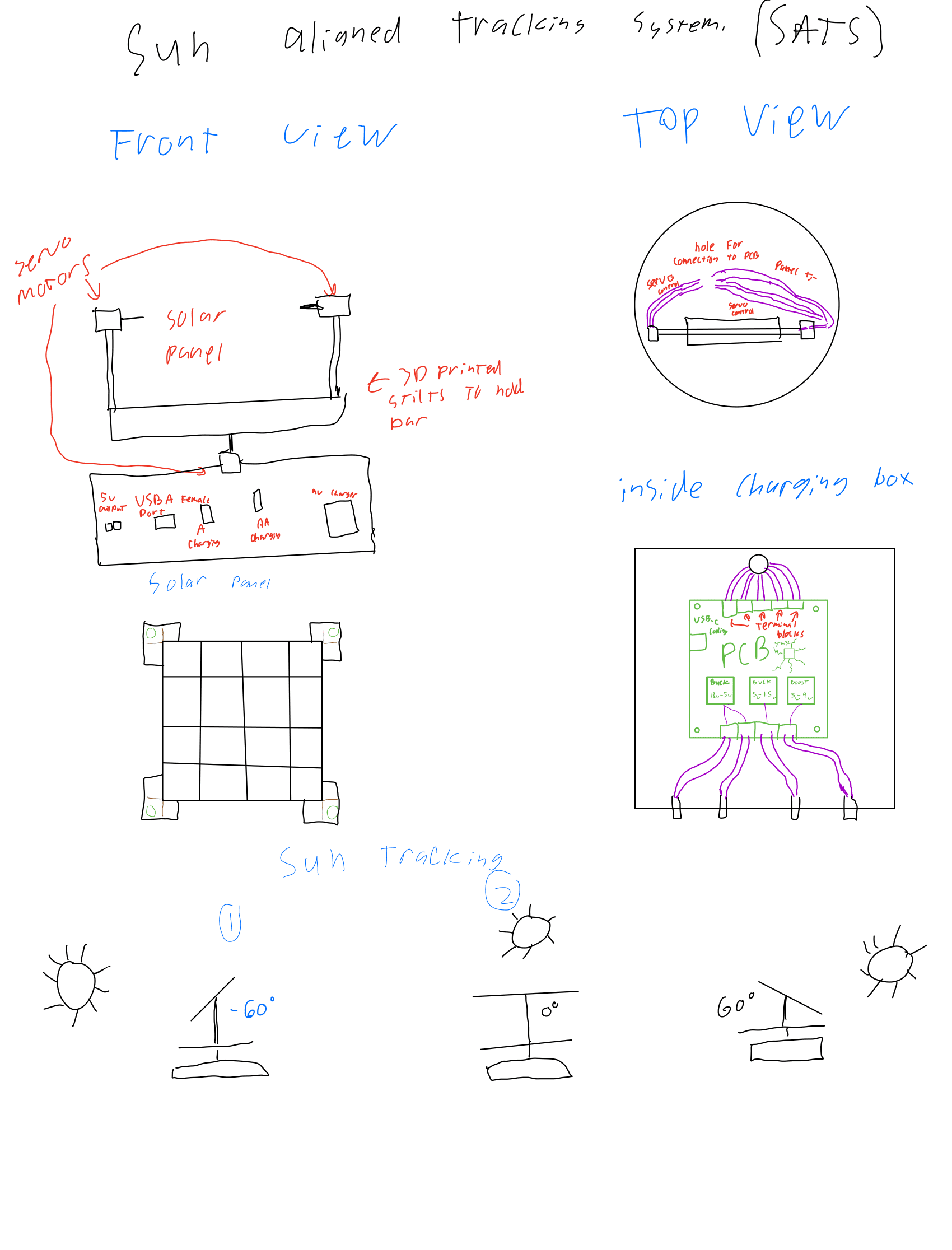 DESCRIPTION This project will involve creating a machine that can automatically follow the sun using LDRs and servo motors, the solar panel will follow the sun to maximize its output no matter the time of day and will let its power flow down through the bottom of the turntable that allows the whole thing to rotate using another servo. The output of the solar panel will be handled by the PCB inside of the box and its power will be saved to later be used to charge desired parts. The project will be power efficient and not use any batteries to run that it did not charge itself. MCU STM32F411 DESIGN will be using Fusion360 to desing (sic) casing for the project to allow for clean operation. will be using EasyEDA and JLCPCB to create the SAPS board to manage power. COMMUNICATION Don’t think will be using any, potentially a 1306 OLED using I2C screen to show status of charging and batter remaining power. MECHANICAL 3 Servos, 1 to rotate the machine on the y-axis and 2 to rotate the solar on the x-axis to follow the sun |