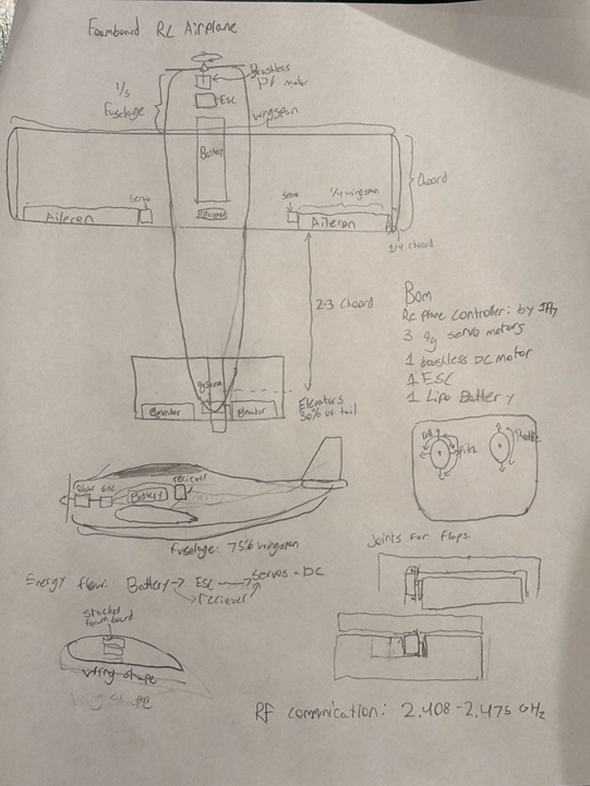 DESCRIPTION This project involves designing and building a small RC airplane from foamboard. The plane will be controlled using a FlySky FS-i6X 10CH 2.4 GHz AFHDS 2A transmitter and FS-iA10B receiver, a reliable standard RC system. The receiver will directly drive servos for control surfaces (elevator, aileron) and an ESC for the brushless motor. 3D-printed mounts will secure the motor, servos, and control horns, keeping the plane lightweight and stable. MCU None provided DESIGN Airframe designed in Fusion 360, built from foamboard 3D-printed parts: motor mount, servo brackets, control horns PCB for plane receiver to neatly connect nRF24L01, BEC, and servos. COMMUNICATION FlySky FS-i6X 10CH 2.4 GHz AFHDS2A RC Transmitter → FS-iA10B Receiver PWM outputs from receiver to servos and ESC. MECHANICAL Brushless DC motor with propeller Electronic Speed Controller for motor 3 9g servos: elevator and aileron control Foamboard airframe, reinforced with tape or lightweight spars 3D-printed parts for mounting and control linkage |