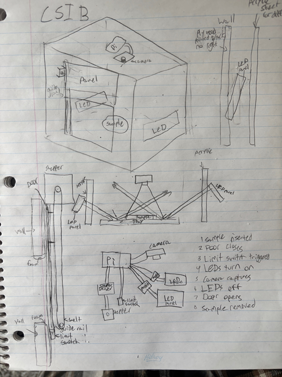 DESCRIPTION This project is an imaging box designed to capture consistent, top-down images of reflective samples between 3 and 5 inches in diameter. The main priority is consistency in lighting, framing, and exposure to support accurate AI analysis. The box will fully block ambient light to prevent variation between images. Even, angled LED lighting will be used to reduce glare and prevent the camera lens from appearing in reflections. The lighting will remain fixed to ensure the same conditions for every capture. The camera will be securely mounted in a level, top-down position. Focus, exposure, and white balance will be manually set and locked. The sample will sit on a neutral, non-reflective platform to maintain a consistent background. Samples will be inserted from the side by a robotic arm. Once the enclosure is sealed, the system will activate the lighting and capture the image under identical conditions each time. The design focuses on stability and repeatability to produce standardized images for AI training and analysis. MCU Dual-core ARM Cortex-M0+ HARDWARE Raspberry Pi SOFTWARE Python DESIGN Design will be made in fusion, some 3D printed parts, black paint, arcylic sheets. COMMUNICATION CSI/Ribbon Cable for the Camera MECHANICAL Stepper motor with a limit switch to move door up/down along guide rails. |