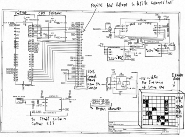 DESCRIPTION "Eternal Life" will serve to recreate Conway's Game of Life seamlessly on a raw E-Ink display. The board, which will communicate to the E-Ink, features an Atmega128p (lots of GPIO) to manually control column/rows through 22v/15v (positive and negative for polarity, which is needed for E-Ink), and send control signals through 3.3v for grayscale control and targeting of pixels. The 22v/15v comes from a DC/DC converter that will generate positive and negative 22v, which then goes to 22v-to-15v convertors (one for positive and one for negative). Additionally, a range between +15v/-15v controlled through a potentiometer goes to VCOM in order to fine-tune ghosting (a concept in E-Ink reverse engineering where pixels do not disappear fully), and the voltage needed on this pin varies screen to screen.