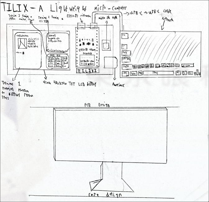 DESCRIPTION A microcomputer built around the ESP32-S3 running a custom lightweight Unix-inspired OS. The hardware consists of a TFT display, external keyboard and an SD card. The OS itself will include a GUI tiling manager (meaning the project wont all be TTY), simple filesystem, and the ability to execute CLI commands such as change directory, make directory, concatenate, grep, etc. The system is designed as a self-contained, low-resource “desktop” within the constraints of a microcontroller. MCU ESP32-S3 DESIGN Fusion 360 for the case design, EasyEDA for PCB design and JLCPCB to manufacture the PCB. COMMUNICATION SPI for TFT display and external flash/SD cards. Serial for programming/debugging via USB MECHANICAL N/A |