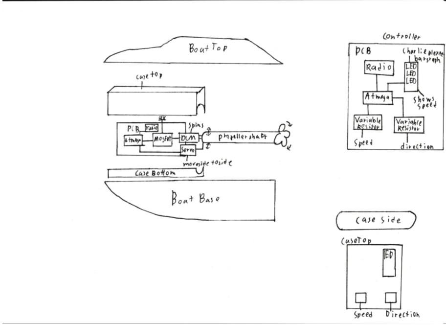 DESCRIPTION This Project will incorporate design software and hardware to create a radio-controlled boat. This boat will be powered by a DC motor regulated by a MOSFET. The project is designed to challenge my design, hardware, and software skills. The main challenge will be design and being able to keep water outside of my electrical components. The controller will be connected via radio to the boat and use variable resistors to control speed and direction. MCU 328p DESIGN I will use Fusion 360 to create my encasement and design my boat. I will also use it to create a user-friendly controller. EasyEDA and JLCPCB will be used to create my controller and motor control PCB they will use surface mount components and be small and well thought out. The boat will have a front water tight are for the electronics and a shaft from the motor to the back with the propeller. COMMUNICATION I will use radio communication to control the boat from a controller and this will all be done on an atmega328P. This is to allow long distance complete control over the boat. MECHANICAL This project will utilize a DC motor as the driving force of the boat and a servo to control the direction of the propeller. These will be controlled by an atmega328P and powered by a 9V battery. |