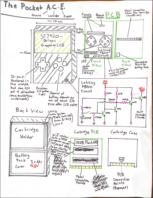 DESCRIPTION The Pocket ACE will consist of a main PCB (might be two, to account for height differences in parts), which will house the inputs, GLCD display, and MCU, as well as several cartridge PCBs, which will have pads along the edge similar to a modern RAM chip or SD card. The cartridges will each house an SPI NOR flash IC. The main board will have an onboard edge pin connector which the cartridges will be swappable in and out of. On startup, the MCU’s custom-written bootloader will check for an inserted cartridge, and if there is one, read the first 32 KB of its flash memory where the program will be stored, and execute self-program memory (SPM) to program its own flash page by page. The program will then be run. The rest of the cartridge memory will be used to store asset tables if necessary (sprite tables, sounds, etc.) although the simple games which this project targets may not utilize this section of memory. MCU 328p DESIGN This project will include a main PCB (maybe two to account for height differences in parts) and several identical cartridge PCBs, which will connect to the main PCB through an edge pin connector and edge pins. All 3D modelling (for both main device and cartridges) will be done in fusion, and PCB design on EasyEDA Pro. PCBs will be ordered through JLCPCB. COMMUNICATION The cartridges, which will house SPI NOR flash ICs, will communicate with the MCU through SPI communication. MECHANICAL N/A |