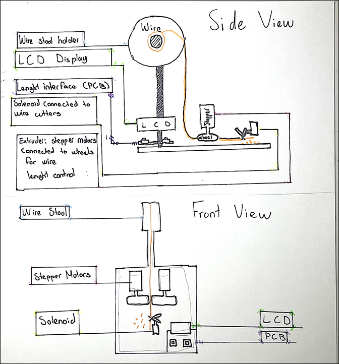 DESCRIPTION This wire cutter will use two stepper motors to roll out a precise distance of wire through an extruder. A solenoid motor will then cause a pair of wire cutters to close, cutting a precise and specific length of wire. The wire length will be adjustable through a button interface. MCU 328p DESIGN Fusion 360 will be used for a 3D printer style design, where the wire stool will rest on top, with the wire leading into an extruder. Only difference is the extruder will push the wire horizontally to the surface to set up a potential wire stripper. On that same horizontal place, the wire cutter system will be placed. The components for the display will be put together on a PCB. COMMUNICATION Serial communication will be used for communication with the motors and buttons, and I2C will be used for communication with the LCD interface. MECHANICAL Wheels will be attached to stepper motors to precisely roll out wire within the extruder, and a solenoid motor will be used to close the wire cutters. |
