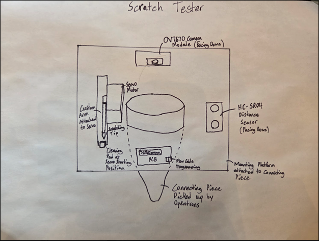 DESCRIPTION The scratch tester will attach to an Opentrons device that will control the x,y, and z positioning of the device. The scratch tester will know it is in position using a distance sensor to measure the tip’s distance from the sample. From there, the scratching tip, which is attached to a servo motor, will swing down, scratching the sample. The sample could be scratched using different forces if necessary. The tip will then go back to its starting position, where a cleaning pad will remove any residue to avoid cross-contamination. Finally, a camera module will take a photo of the resulting scratch to see if the adhesive has remained or rubbed off. The scratch tester will then move on to the next sample and continue until all samples are scratched. HARDWARE 328p SOFTWARE The code will test the distance (with the HC-SR04), swing the arm, either using half or full stepping depending on the desired force, to the desired sample to scratch it and then move back. Finally, a OV7670 library will be used for the camera to take a photo of the scratch. DESIGN The project will use Fusion 360 to make the mounting platform, pipette connecting piece, and servo arm. JLCPCB will be used for the PCB design. COMMUNICATION The OV7670 camera module uses I2C (I2S?) communication. MECHANICAL The scratch tester makes use of a servo motor to control the scratching tip. |