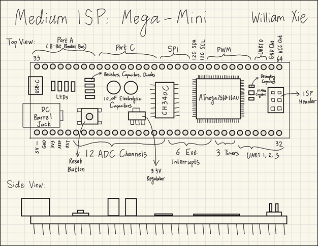DESCRIPTION This project is a breadboard-compatible development board that features an ATmega2560. Since the 2560 has 100 pins, the development board will take up almost the entire breadboard if all pins are broken out. Therefore, the Mega-Mini only breaks out the 64 most important pins on the 2560, and they are divided equally into two rows, so there will be 32 pins on each side of the board, leaving half of the breadboard for prototyping. The Mega-Mini will be wider than typical breadboard-compatible development boards (Nano, Pro Micro, etc.), as the 2560 has a much larger size than other MCUs, so there will be only one row left on each side of the breadboard for wirings when the Mega-Mini is attached to the breadboard. In addition to the 2560, there will be a CH340C serial chip, a 3.3 V regulator, a reset button, a USB-C connector, a 2.1 mm DC barrel jack, an ISP header, and some resistors, capacitors, and diodes on the Mega-Mini. All components except for the barrel jack and the ISP header will be SMD. The final board will keep almost all of the most important features of the 2560, including 4 hardware UARTs, 6 external interrupts, 3 timer inputs, 6 high-resolution 16-bit PWM outputs, 12 ADC channels, an 8-bit parallel bus, SPI and I2C communication protocols, and a total of 58 GPIO pins. HARDWARE 2560 SOFTWARE Arduino C (high-level) and Assembly will be used to test the functionality of the final board. DESIGN The Mega-Mini PCB will adopt a 4-layer design. In addition to the standard top and bottom layers for signal traces, there will be a solid ground plane (layer 2) that acts as the heat sink for the 2560 and a power plane (layer 3) that will be split so one area is 5 V and a smaller section is 3.3 V. No 3D printing is involved in this project. COMMUNICATION The final board will be able to communicate with other devices via UART, SPI, I2C, and USB. MECHANICAL N/A |