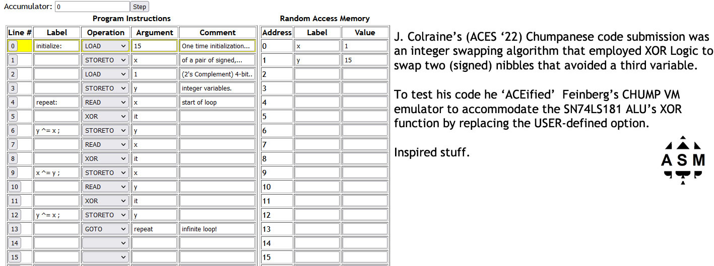 ACEification suggested by J. Colraine (ACES '22) (74LS181 XOR feature replaces USER function)