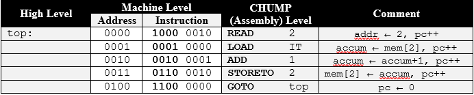 For this segment's accompanying video, have a paper copy beside your partial processor that includes a table containing both your CHUMPANESE assembly code statements adjacent to their equivalent machine code instructions. Single step through the clock signal while discussing and confirming your instructions are accurately preseted on the LEDs.