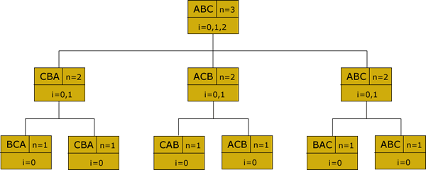 The code presented on page 555, determines and displays the permutations of a String (StringBuffer). The tree can be used to help unravel the recursive magic of the code. String permutations are displayed to the screen when the base case is achieved, equivalent to the bottom level (leaves) of the tree below.